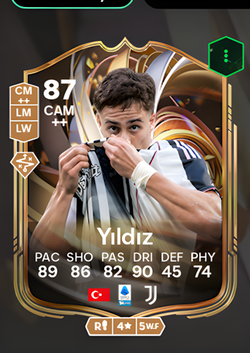 Kenan Yıldız's Ratings Reload card introduces an electrifying Central Attacking Midfielder with an impressive overall rating of 87, boasting standout attributes such as 89 pace, 86 shooting, 82 passing, and a remarkable 90 dribbling. These stats make Yıldız a dynamic force in the midfield, capable of dictating play and launching incisive attacks. With his speed and dribbling prowess, he can swiftly break through defensive lines, creating scoring opportunities and giving your team the edge needed to secure victory in crucial moments.