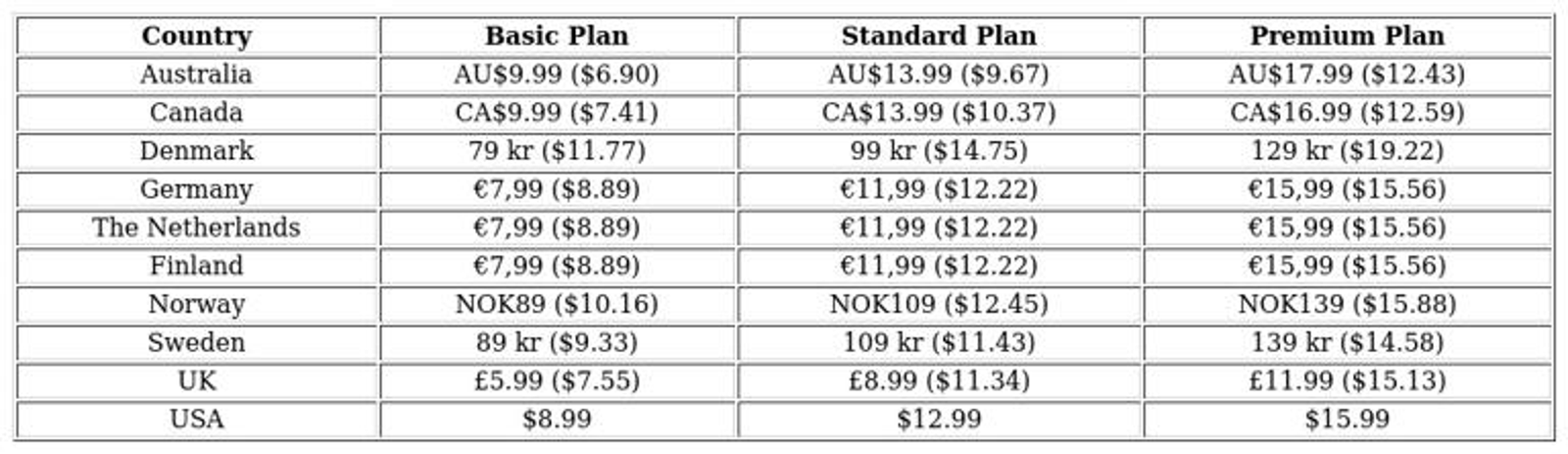 The UK has also experienced notable price hikes. Since its price increase in May 2019, the standard plan has risen over 50 percent—from $7.55 in 2012 to $11.34 in 2019. While the basic plan remained stable, the premium plan increased by more than a third since its 2013 introduction.