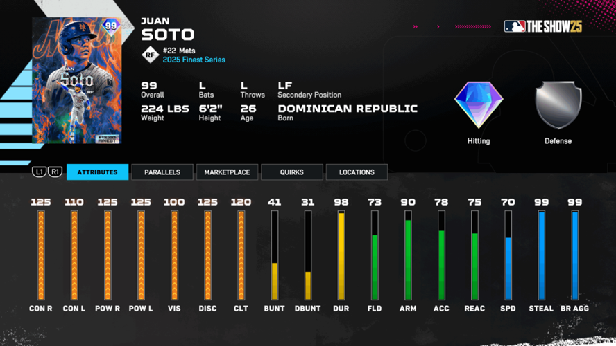 Among the contenders, Juan Soto emerges as the top pick by a significant margin. His card, especially the Finest Series version, is widely regarded as one of the strongest in the game, combining exceptional stats with a compelling aesthetic. At 26 years old, Soto's attributes are nearly flawless—over 120 in most batting categories. His power is particularly formidable, and his contact stats—125 against right-handed pitchers and 110 against lefties—are elite. Additionally, his stealing ability and baserunning Bats are maxed out at 99, making him a versatile offensive threat. While his speed could be marginally improved, it still complements his overall skill set perfectly.